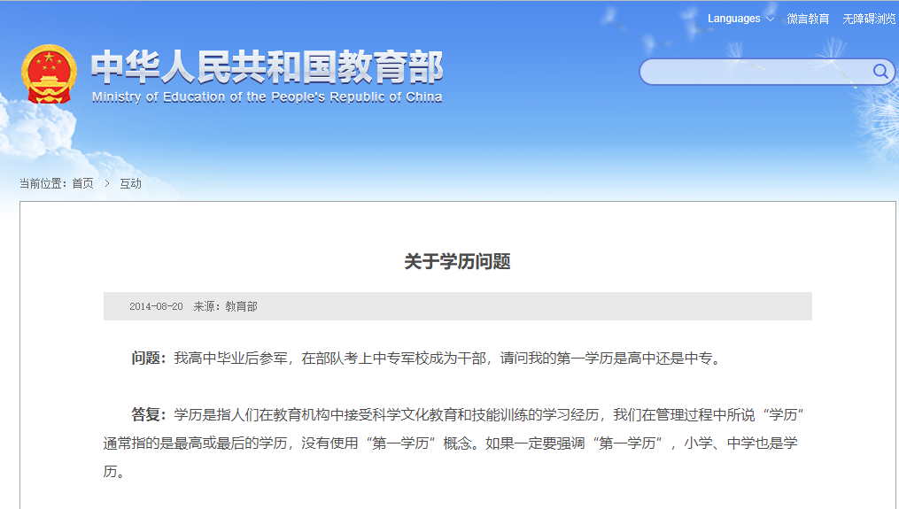 2014年8月,教育部在答复“我高中毕业后参军,在部队考上中专军校成为干部,请问我的第一学历是高中还是中专。”的提问中称: