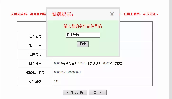 三、缴纳报考费 (一)确认身份信息 考生要再次核对个人身份信息、报考科目是否与个人所选一致、订单金额是否有误,若无误,点击“前往缴费”按钮(见图5),并在弹出的身份确认信息框(温馨提示),请输入考生在广东省自学考试管理系统中的考生证件号码(所输入证件号码务必于系统中信息完全一致,见图6)。
