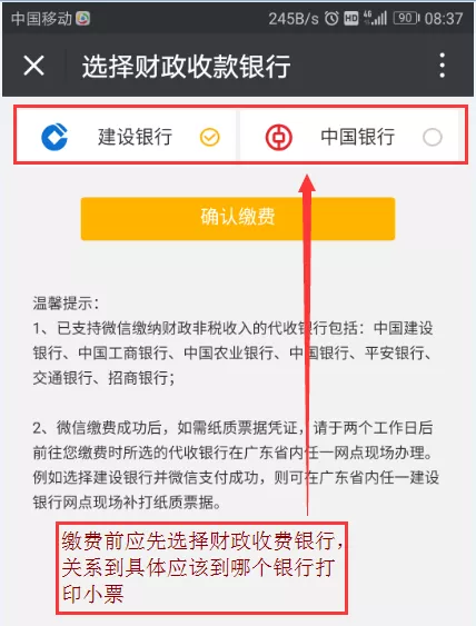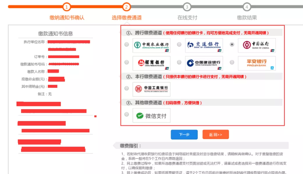 缴费通道:可以认为是所缴费用最终存入的银行,是一个代收银行的概念;有几点应该注意: ❶ 选择本行缴费通道中的银行,只能用该行所发的银行卡进行支付。如:选择本行缴费通道中的中国工商银行,那么考生只能使用工行所发银行卡进行支付。 ❷ 选择跨行缴费通道中的银行,可以使用该行所发的银行卡进行支付,也可以选择其他银行所发的银行卡进行支付。如:选择跨行缴费通道中的中国农业银行,那么考生可以使用农行银行卡进行支付,也可以使用中国工商银行的银行可进行支付。 ❸ 其他缴费通道目前只包含微信支付。 ❹ 如考生要到银行打印小票,则必须到所选通道银行(如1中举例的中国工商银行,2中举例的中国农业银行)打印(凭缴款通知书号、执收单位编码(名称)),微信支付则到所选择的财政收款银行打印小票,见下边示例。