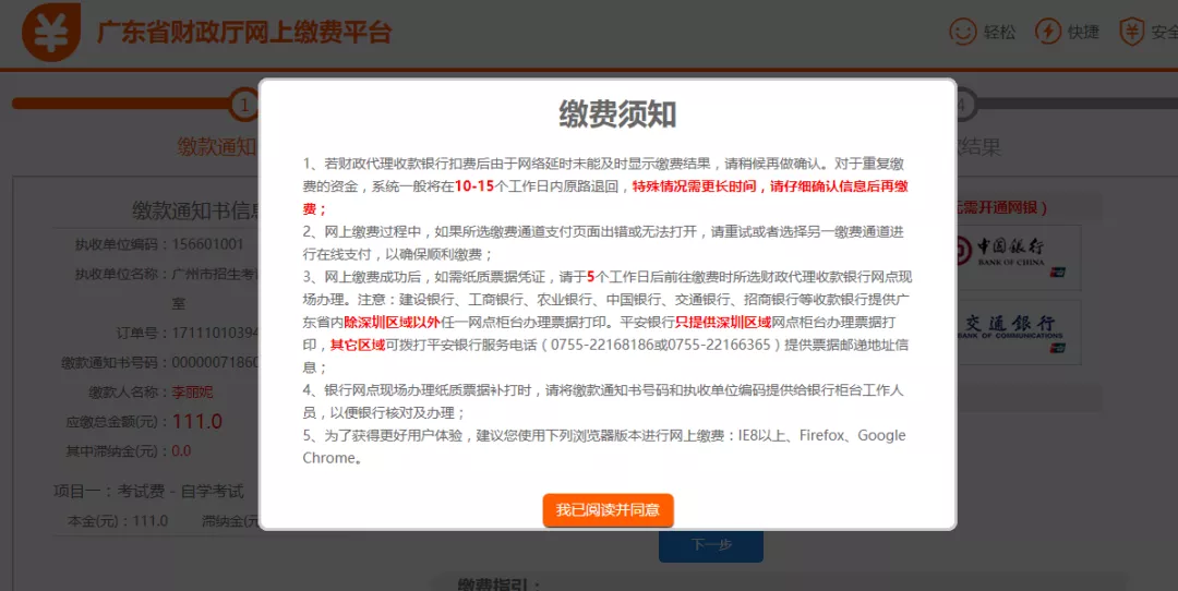 (二)进行网上缴费 考生确认身份信息后,页面跳转至财厅缴费系统。考生认真阅读缴费须知,并点击“我已阅读并同意”按钮,可进入下一个界面,考生按照界面提示完成缴费(见图7-15)。